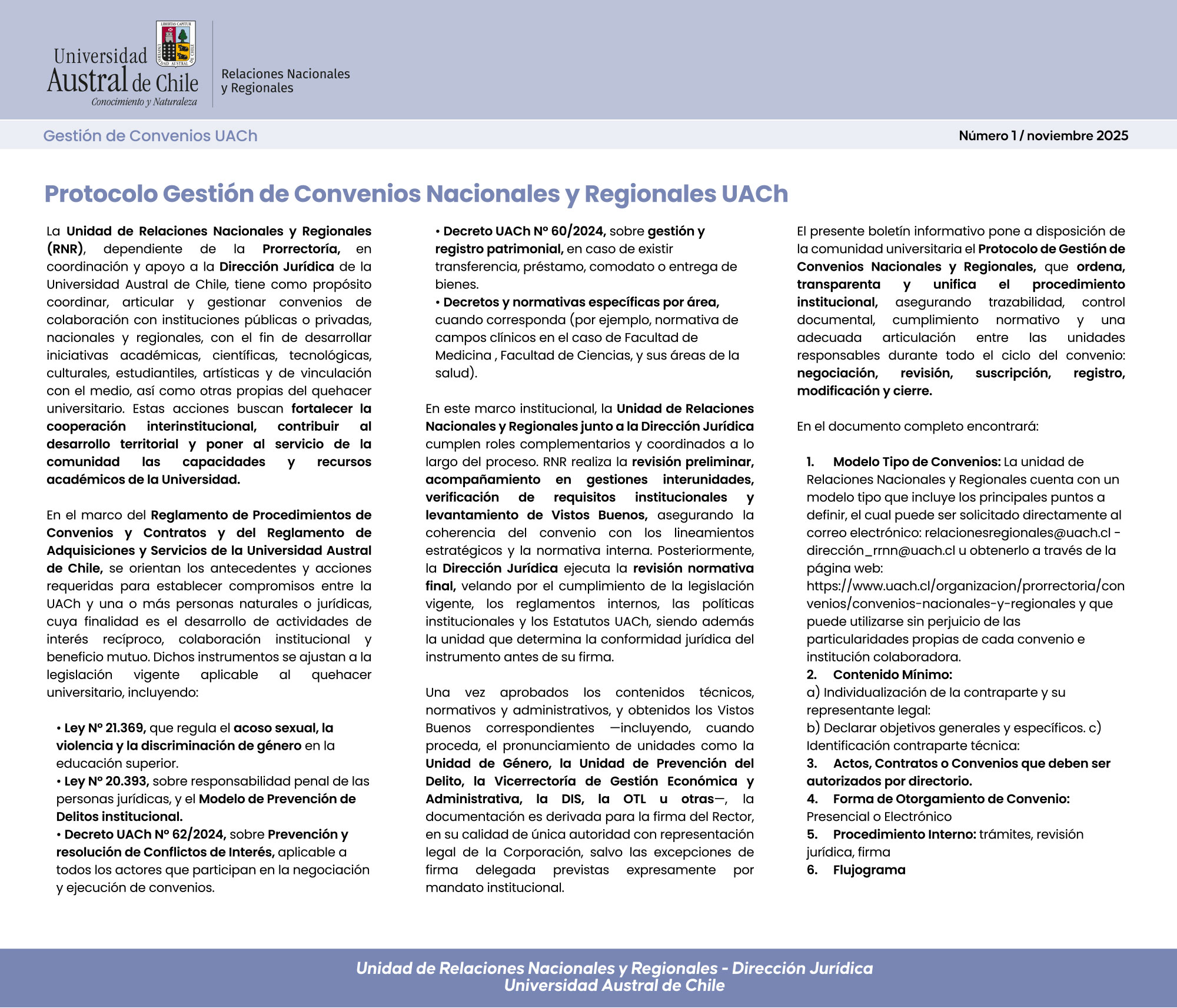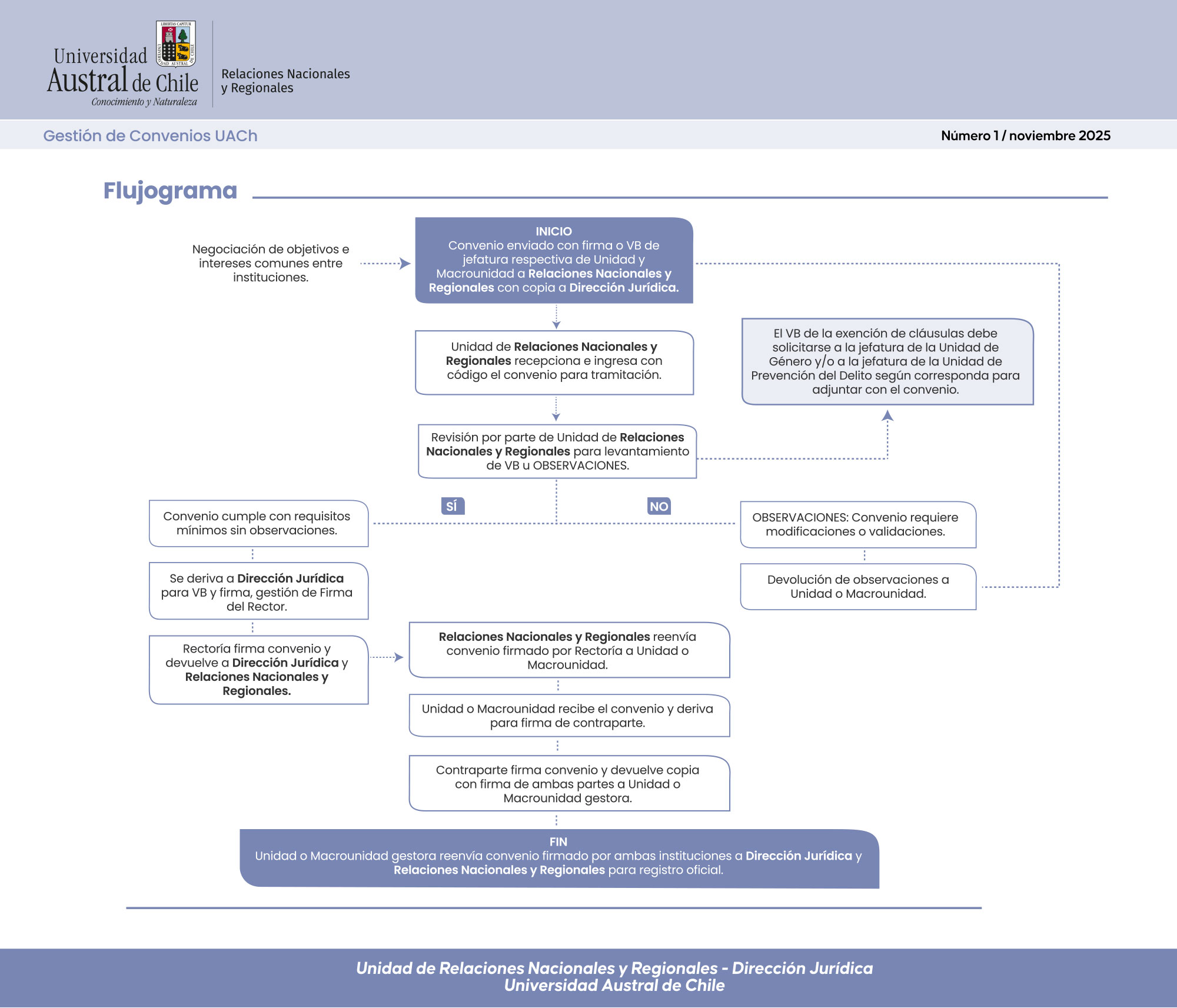A continuación encuentran el Flujograma y Protocolo resumido para la firma del convenio. Cada Unidad tiene la libertad de explorar vínculos y comenzar las negociaciones con organizaciones de interés, sin embargo, para recibir el Visto Bueno de la Vicerrectoría, el convenio debe ser visado por la Dirección de Vinculación con el Medio (Antes de ser enviado a Relaciones NAcionales y Regionales).