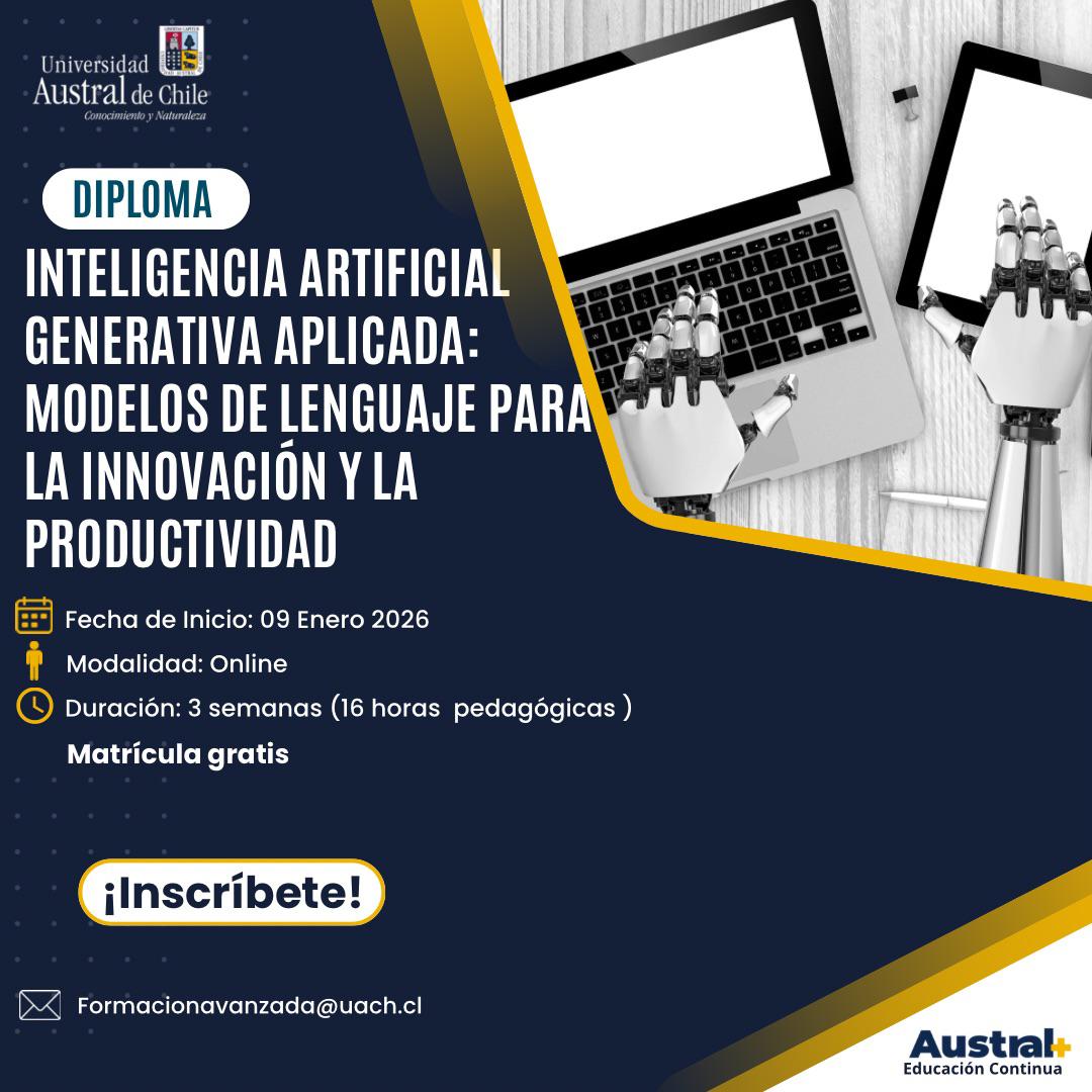 La Universidad Austral de Chile, a través de su área de Educación Continua, invita a postular al Diploma “Inteligencia Artificial Generativa Aplicada: Modelos de Lenguaje para la Innovación y la Productividad”, un programa orientado a la incorporación práctica, responsable y estratégica de herramientas de inteligencia artificial generativa en contextos profesionales y organizacionales.